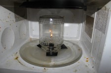- Okamžitě přikrejeme toto hořící párátko (špejli) sklenicí odolnou vysokým teplotám (zavařovací sklenice) na již připravené plastové podložky