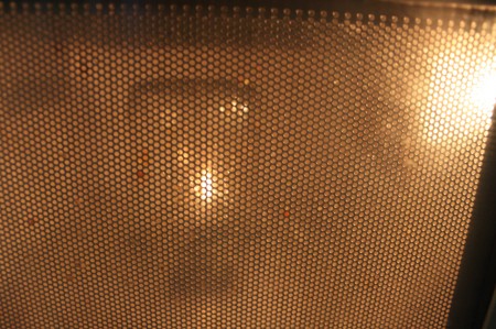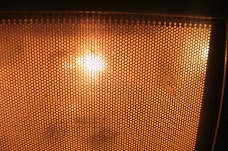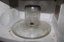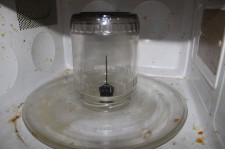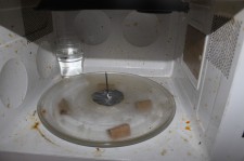 - Do zadního rohu mikrovlnné trouby umístíme malou sklenici vody (slouží pro ochranu magnetronu - zabrání tomu, aby eventuelní přebytek energie přehřál jeho anodu)