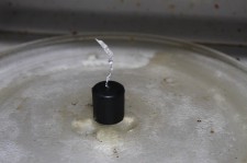 - Do prostřed mikrovlné trouby (na talíř) postavíme zátku (nevodivou), nebo korek, do které zapíchneme párátko, nebo špejli